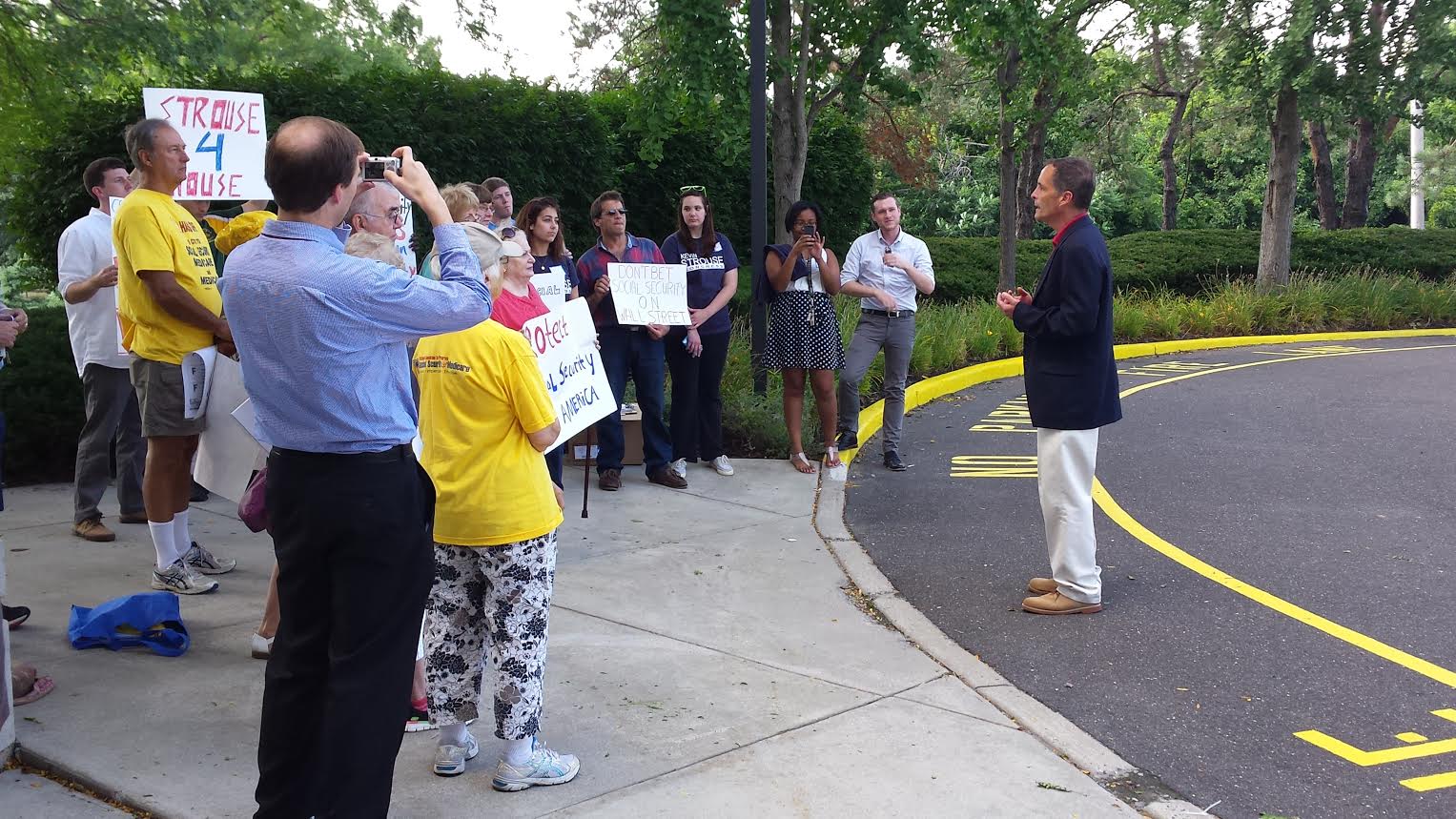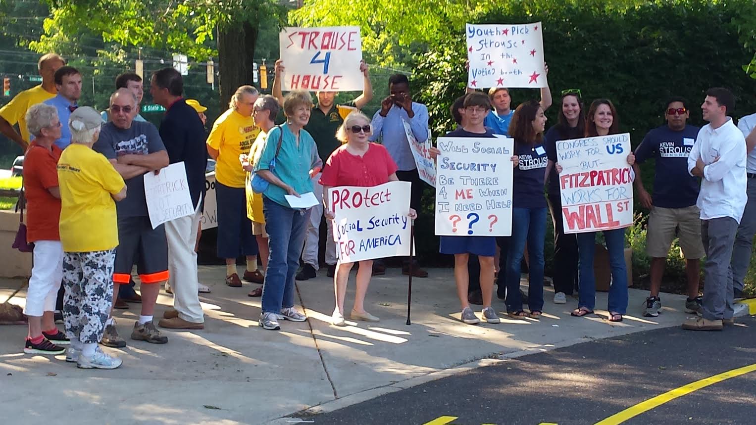 Supporters of Democratic congressional candidate Kevin Strouse gathered outside of incumbent Republican Congressman Mike Fitzpatrick’s Middletown offices on Thursday to protest his voting record on social security.