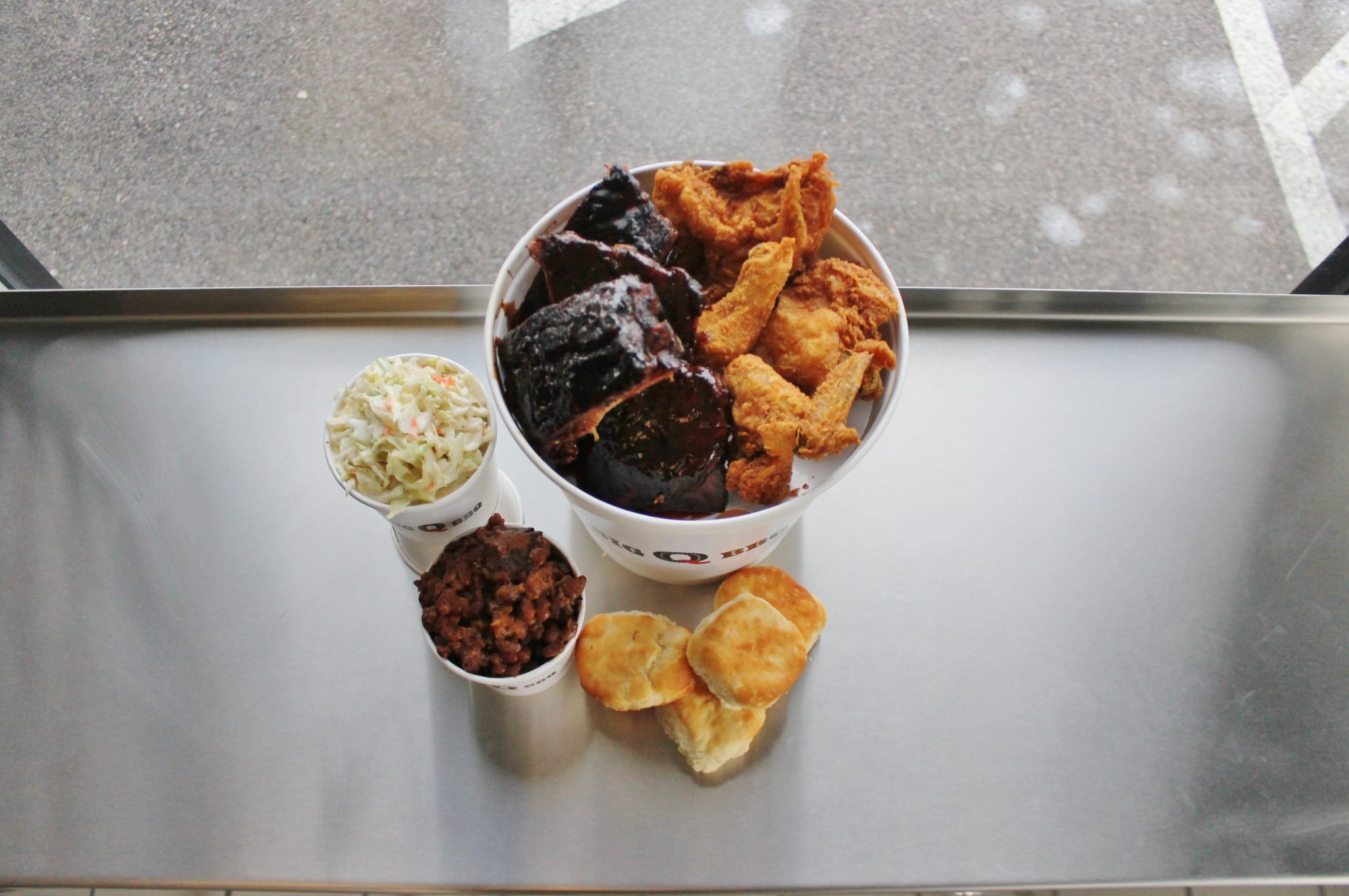 Starting last week, Big Q BBQ began offering a $20 meal bucket that will comfortably feed a family of four. The bucket deals offer combinations of ribs, ribs and fried chicken or just fried chicken. Each order comes with four free biscuits and two family-sized side dishes.
