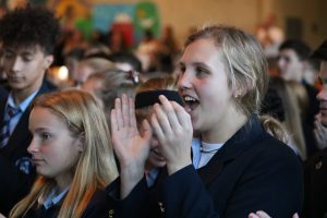 Lynch, the retired CEO of TE Connectivity, joked the students seemed to have much more pep than he would have when he sat for an assembly more than 40 years ago.