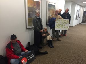 In the lobby of Fitzpatrick’s office in Middletown, Brian Klein of Quakertown said he was protesting the tax bill because it is “an attack on health care.” He said Medicaid expansion funding that is threatened by the current tax reform plan allowed him to go to the doctor and led to the discovery of colon cancer. The expanded health care helped him afford cancer treatment and monitoring.