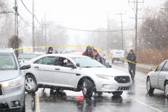 The man, according to the Bucks County District Attorney’s Office, was shot after pulling a weapon around 12:15 p.m. Friday on Edgely Road just south of Runway Road. He had reportedly exited a purple sedan with front-end damage and New York plates and confronted police with the weapon.