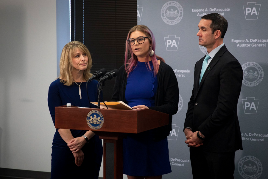 Rape survivor Samantha Fullam speaks as Auditor General Eugene DePasquale and Pennsylvania Coalition Against Rape Kristen Houser look on during a press conference on Thursday.