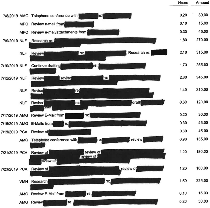 Invoices show the request for O’Brien’s reports sparked a number of telephone calls from the law firm. The recipients of the calls were redacted. The lawyers also spent numerous billable hours on research and reviews.