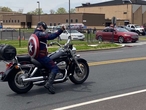 One Bensalem resident drove in with his own firetruck, a caravan of motorcyclists, including one dressed as Captain America, drove by and waved to the family and local company Thackray donated their crane machine to hoist an American flag above Green Lane.