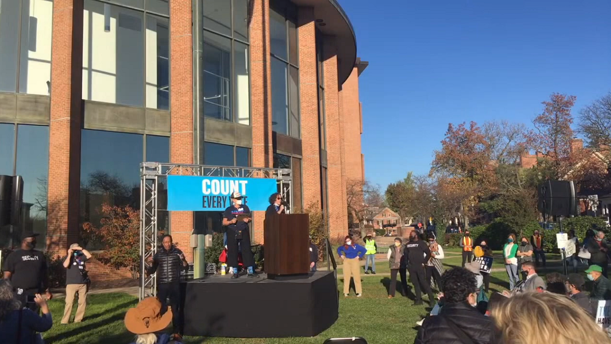 “Before all the votes were counted, we heard the chilling words of the president of the United States declaring himself the winner of this election. That is not how democracy works or what it looks like,” a speaker told the group.