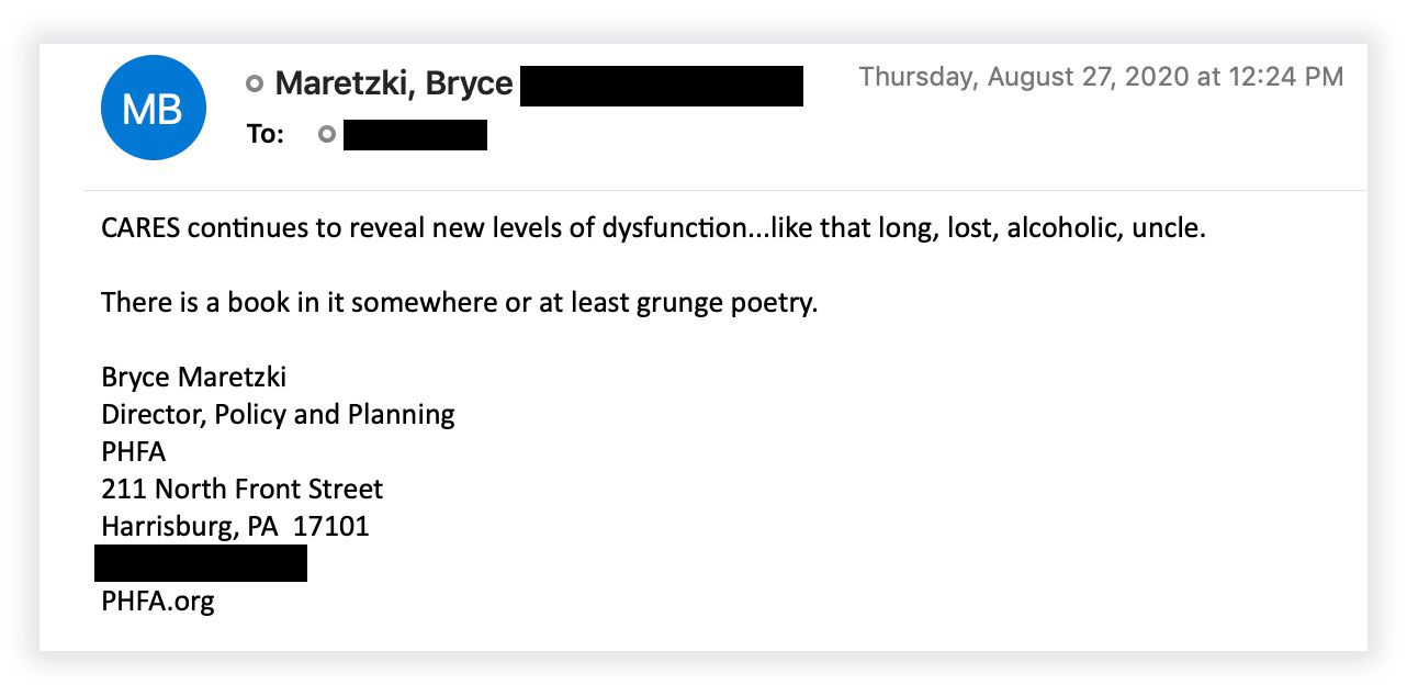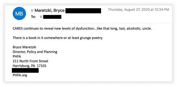 It was a mess that Maretzki, a senior official at the Pennsylvania Housing Finance Agency, had to make the best of — even as he vented to a colleague, that afternoon, that the program “continues to reveal new levels of dysfunction … like that long, lost, alcoholic uncle.”