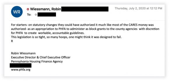Pennsylvania Housing Finance Agency Executive Director Robin Wiessmann vented to Gov. Tom Wolf’s deputy chief of staff about restrictions in the state law that created the rent relief program. Wiessmann later called the remarks “hyperbole.” Email addresses and phone numbers have been redacted.