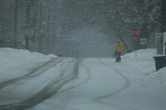 A person walks a dog through a snowy Langhorne Borough in 2021.