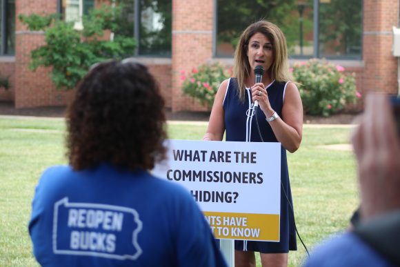 Last Wednesday outside of the Bucks County Administration Building in Doylestown Borough, Megan Brock, of Northampton Township, and Jamie Walker, of New Britain Township, held a press conference to bring a spotlight to their fight to obtain records related to the Bucks County Health Department’s 2021 COVID-19 guidance around masking and quarantines at schools.