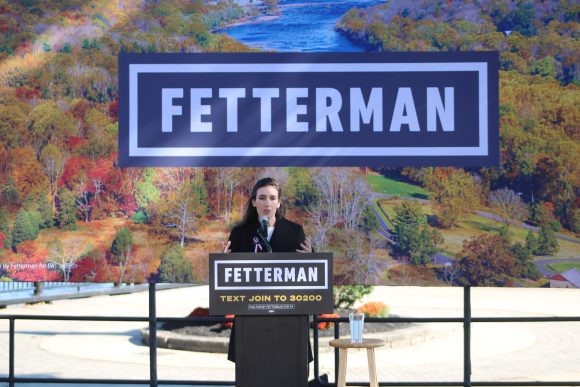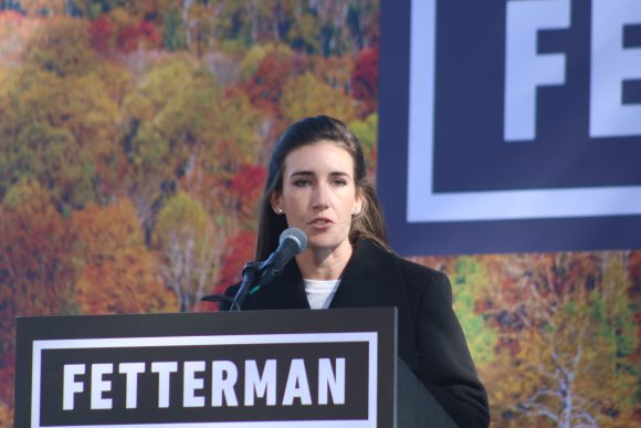 The second lady and wife of the candidate, Gisele Barreto Fetterman, warmed up the crowd for her husband and encouraged them to get out and vote for him. She promised Fetterman would fight for Pennsylvanians “like he fights for his family, like he’s fought for his life.”