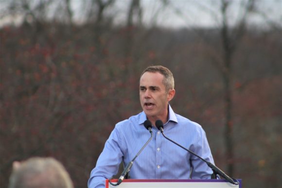 State Sen. Santarsiero speaking Sunday at a rally in Newtown Township.