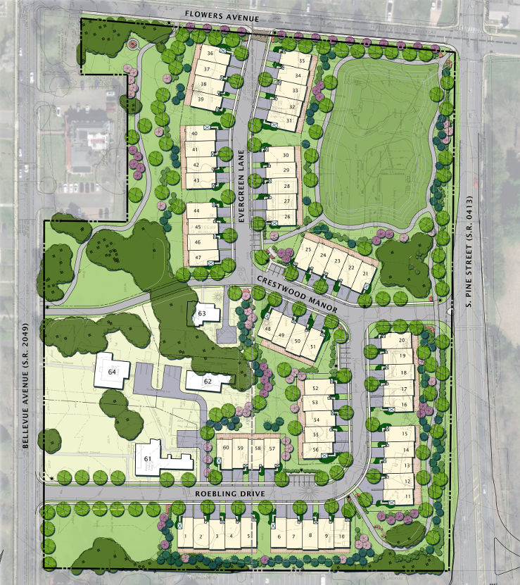 Plans also include a privately maintained neighborhood road overseen by a homeowners’ association with access from Bellevue Avenue and South Pine Street, and an emergency route along Flowers Avenue.