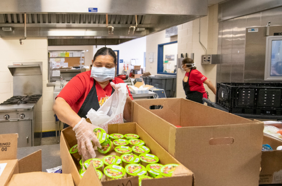 A school lunch worker preparing meals in April 2020. Credit: Lance Cheung