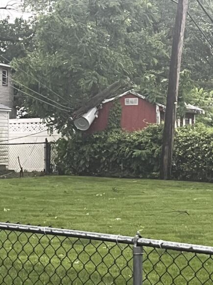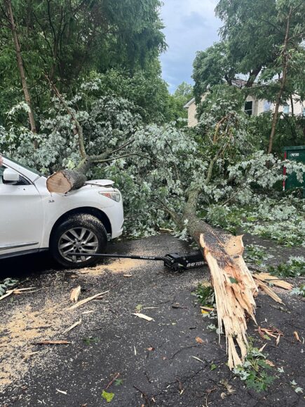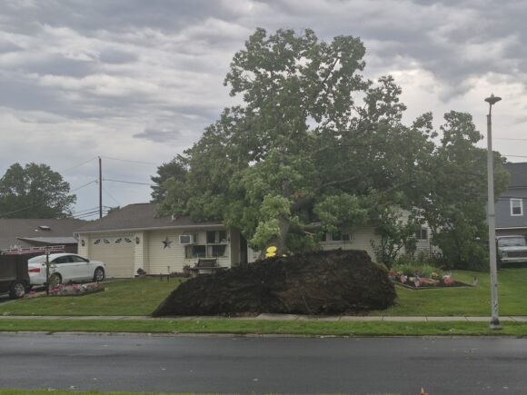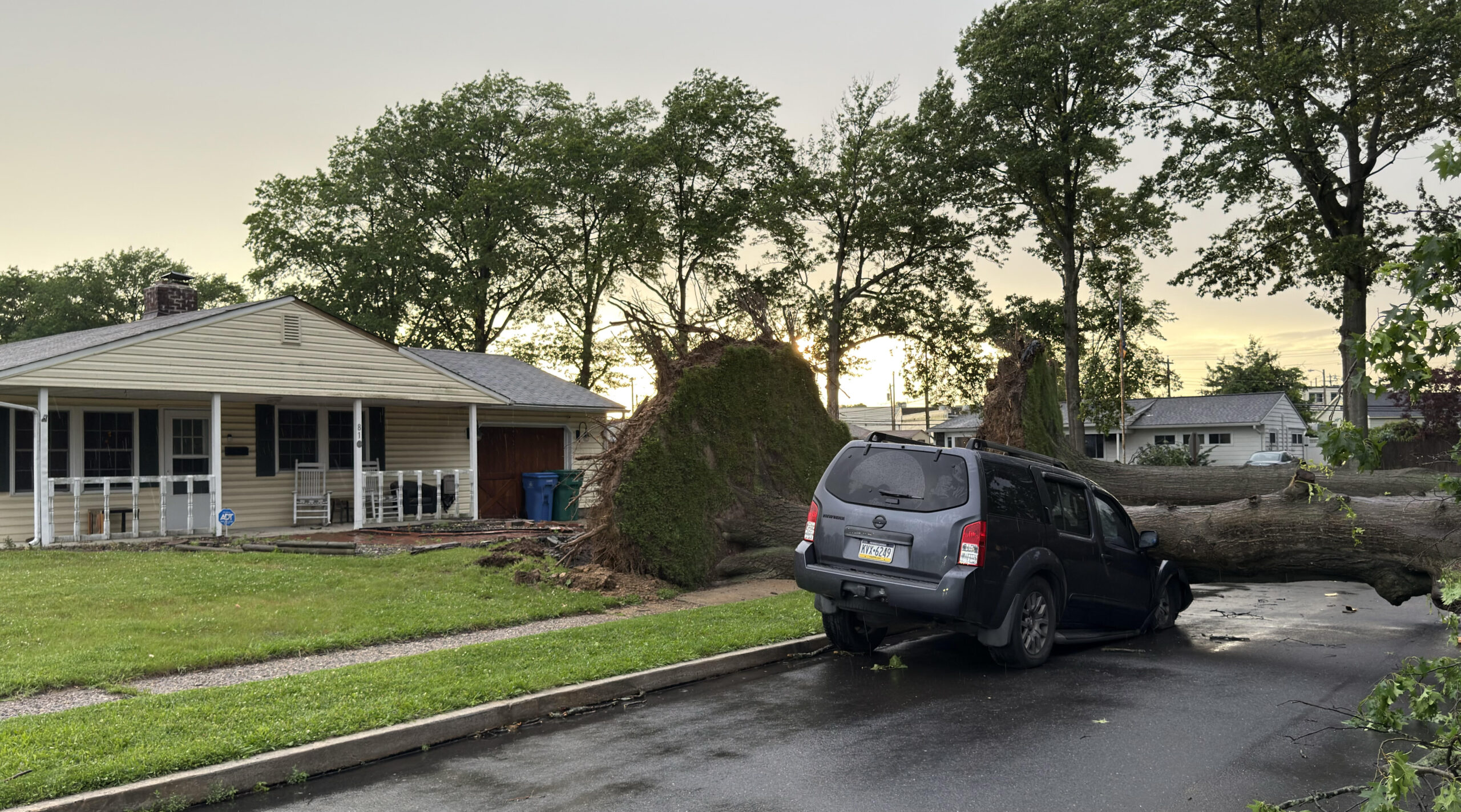 At the intersection of Gamewood Road and Goldenridge Drive in Bristol Township, two large trees were reported to have toppled over during the storm, crushing a parked vehicle beneath them. Nearby, two homes sustained structural damage as a result of falling debris and high winds.