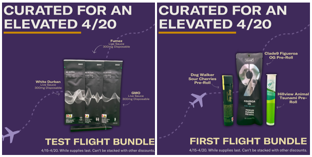 For those experiencing 4/20 for the first time or looking to indulge without breaking the bank, try the Test Flight or First Flight Bundles. Each bundle has a sativa, hybrid, indica in a convenient and easy to use form. The Test Flight consists of three (3) 300mg live sugar disposable vape pens while the First Flight contains three (3) 1g high-quality pre-rolls.